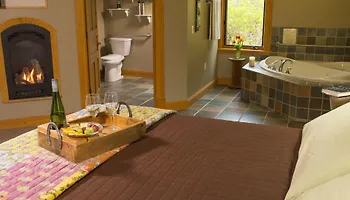 Guest rooms are equipped with a sofa set and a writing desk, as well as a stone fireplace for guests' comfort. Nice touches include a bathtub, a separate toilet and a shower, along with bathrobes and towels.